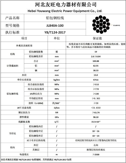 二、 产品执行标准:YB/T124-2017《铝包钢钢绞线》;