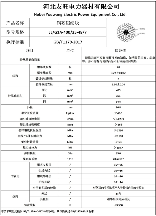 四、JL/G1A400/35钢芯铝绞线国标厂家直销价格产品基本参数及样本图片:
