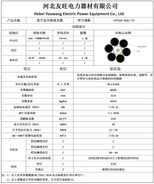 四、24芯架空光缆OPGW-36B1-70直销价格参数及样式图表: