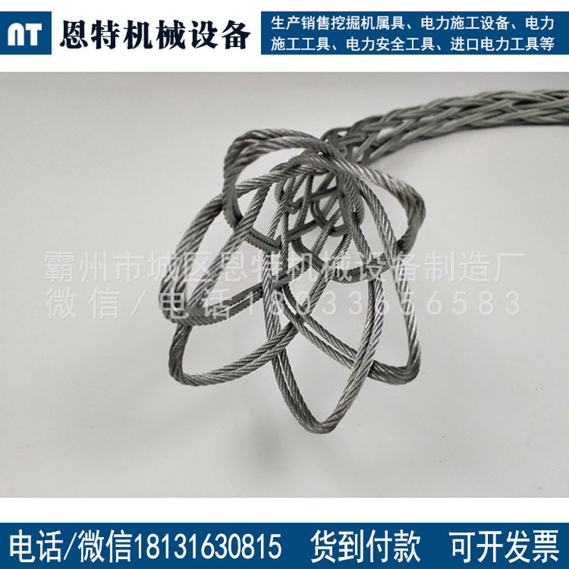 产品用途及性能:工人在架设大型电缆时,由于线太长太重不便于起重,因此,就需要用一个工具,也就是电缆网套,先套住电缆,然后用人或者起重工具拖住电缆网套,从而达到架线的目的,同时,也可以用吊网挂住电缆。注意,吊网套电缆的部分为网状结构,越拉越紧,如果想松开,只需要向拉线的反方向推动吊网,即可取出电缆,使用非常方便。本厂专供:海上油田、风电制造、移动公司、电力、铁道、船舶、电缆、建筑、钢铁、石化、机械行业等领域。(质量品质保证,创行业)用于输变电线路专业生产:拉眼式拉线网套连接器;单线编织双眼式电缆网套;双线编织单眼式电缆网套;风电专用网套;排污泵专用网套;旋转式网套;旋转连接器;开口式中间网套;尼龙拉线网套;导线网套连接器;馈线吊网;镀锡铜网套;单环网套。本厂专供:海上油田、风电制造、移动公司、电力、铁道、船舶、电缆、建筑、钢铁、石化、机械行业等领域。