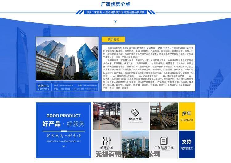 无锡市百帮特钢有限公司秉承“质量效益,诚信共赢”的核心价值观,建设物流增值链,做好完善的服务,本着信誉,薄利多销的原则,以服务,灵活的经营模式开拓市场;公司与各大钢厂的长期稳定的合作关系,保证了公司为新老客户提供过硬的产品和服务,努力打造行业中水平的营销体系。