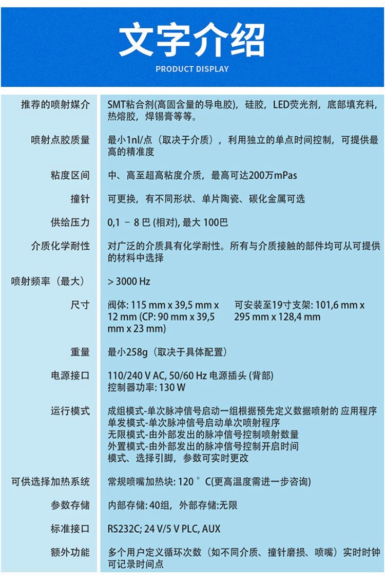 适用介质 | SMT 胶水(含有颗粒的结构胶) | ||