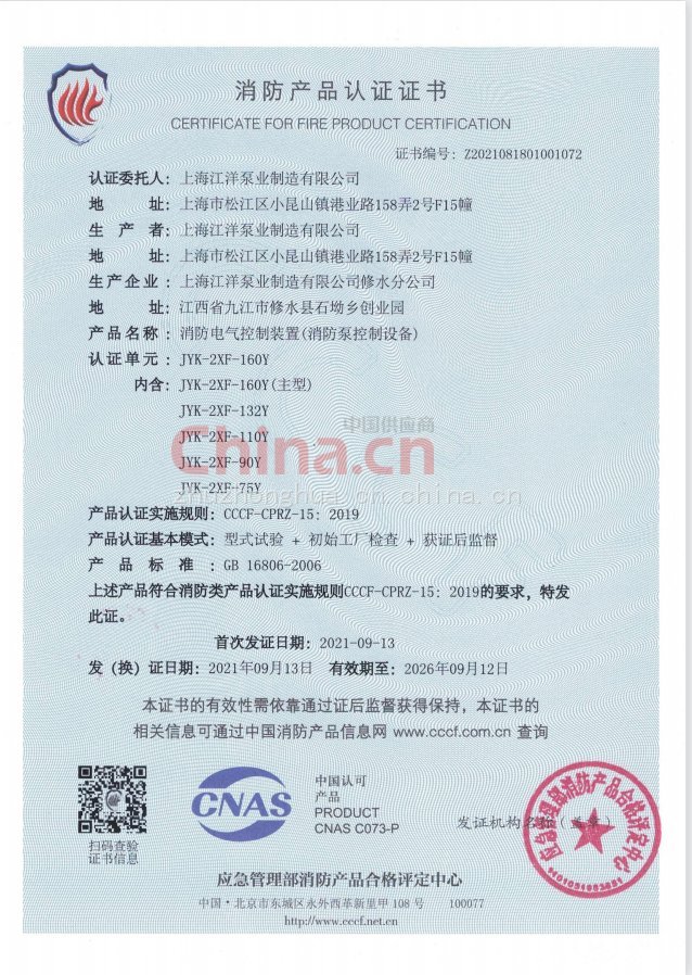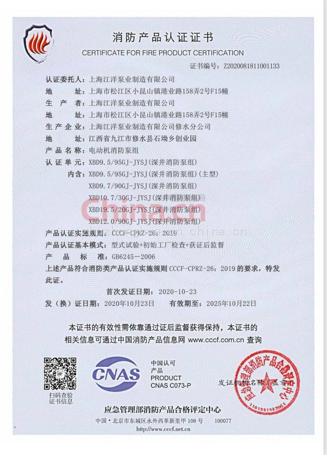 消防泵要CCCF认证吗XBD10.0/15G-L CCCF 喷淋泵 江洋泵业 验收无忧 品牌 | 上海江洋 | ||