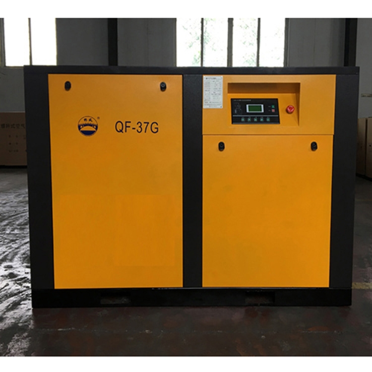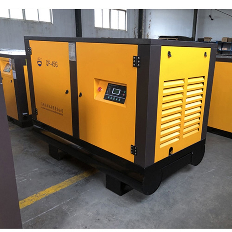 螺杆空压机型号:QF-45G,驱动方式:直联,电机功率:45千瓦,排气量:8立方每分钟,工作压力:0.8MPa,外形尺寸:1750*1000*1450,重量:880公斤,分为普通工频、永磁变频两种,又分为固定式、移动式两种,固定式用于工厂车间统一供气、喷砂房防腐喷砂等,移动式分为两轮移动、四轮移动,常用于户外防腐工程钢结构、管道、石油储罐喷砂除锈。
