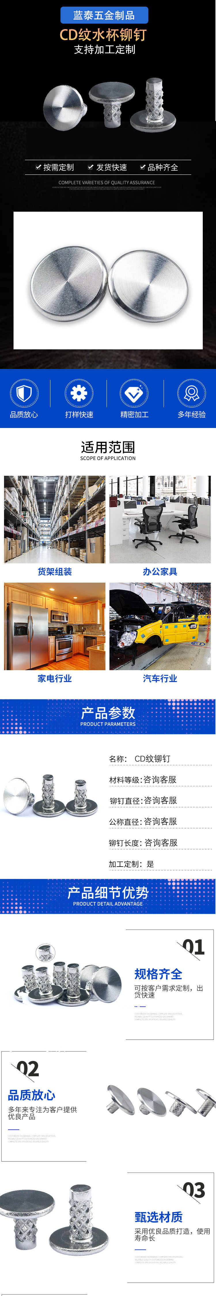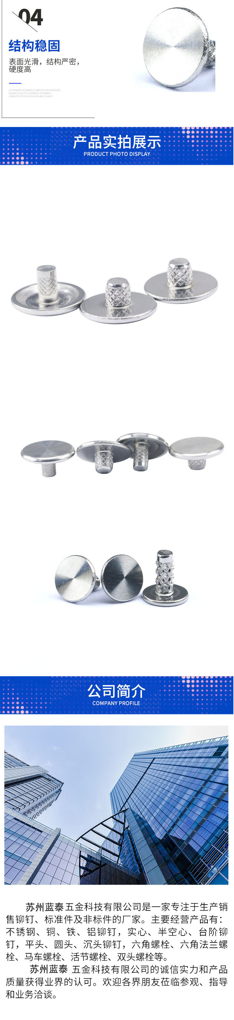 主要经营产品有 | 不锈钢、铜、铁、铝铆钉,实心、半空心、台阶铆钉,平头、圆头、沉头铆钉,六角螺栓、六角法兰螺栓、马车螺栓、活节螺栓、双头螺栓、机螺丝、紧定螺丝、六角木螺丝、自攻螺丝、焊接螺丝,油管、接头、非标车削件 | ||