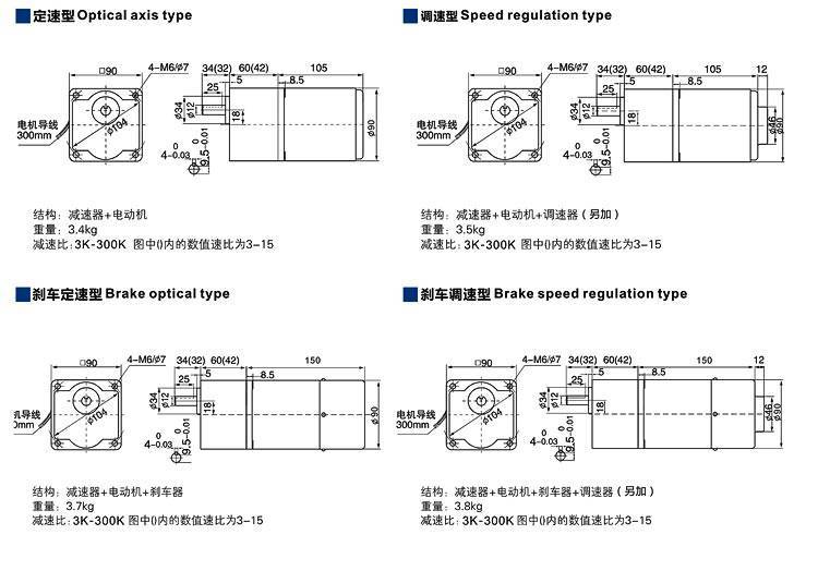 刹车电机:可正反转,具有保持力,可调速,功率范围6W~300W。
