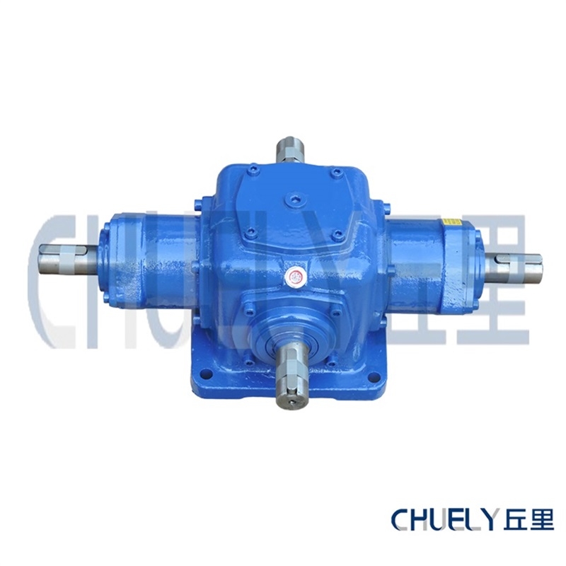 性能特点: 1、T系列螺旋伞齿轮转向箱,标准化,多品种, 速比全部为实际传动比。平均效率达98% 。 2、螺旋伞齿轮转向箱有单轴、双横轴、单纵轴、双纵轴可选。 3、齿轮转向箱可以正反运转,低速或高速传动平稳,而且噪声低,振动小,承受力大。 4、当速比不为1:1时,横轴输入、纵轴输出为减速,纵轴输入、横轴输出为增速。