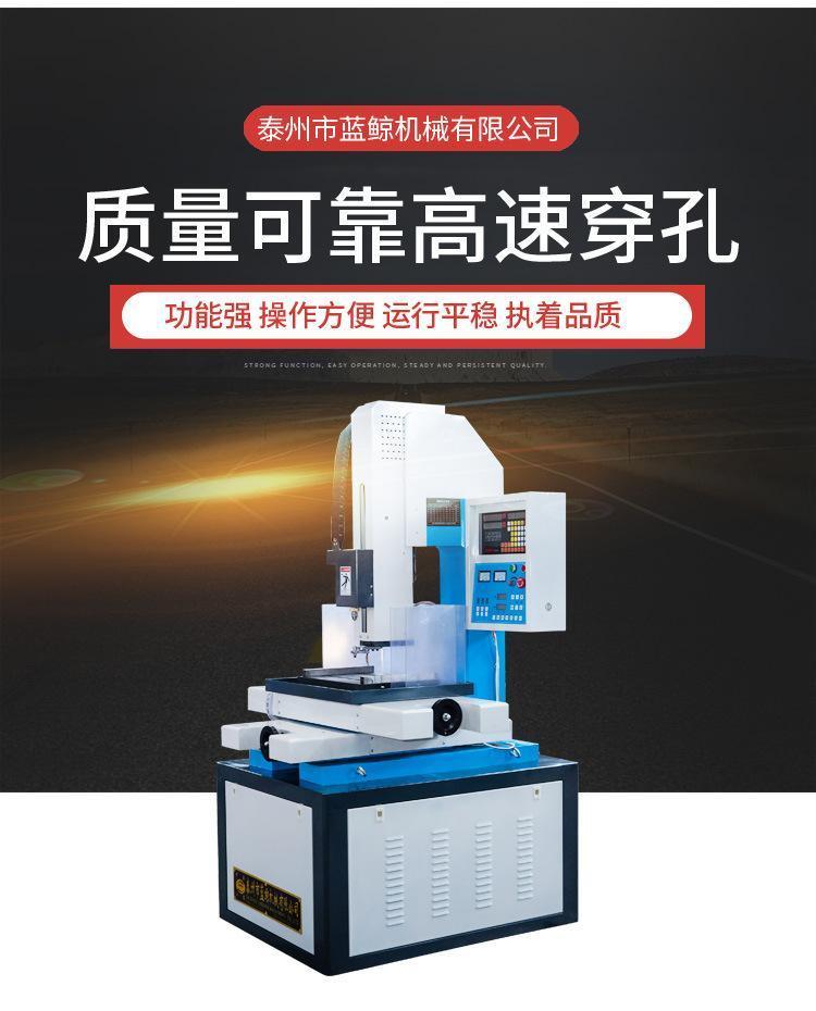 电极与金属间放电产生高温腐蚀金属达到穿孔的目的,用于加工超硬钢材、硬质合金、铜、铝及任何可导电性物质的细孔。最小可加工0.015mm的小孔,也可加工带有锥度的小孔,被广泛使用在精密模具加工中,一般被当作电火花线切割机床的配套设备,用于电火花线切割加工的穿丝孔、化纤喷丝头、喷丝板的喷丝孔、滤板、筛板的群孔、发动机叶片、缸体的散热孔、液压、气动阀体的油路、气路孔等