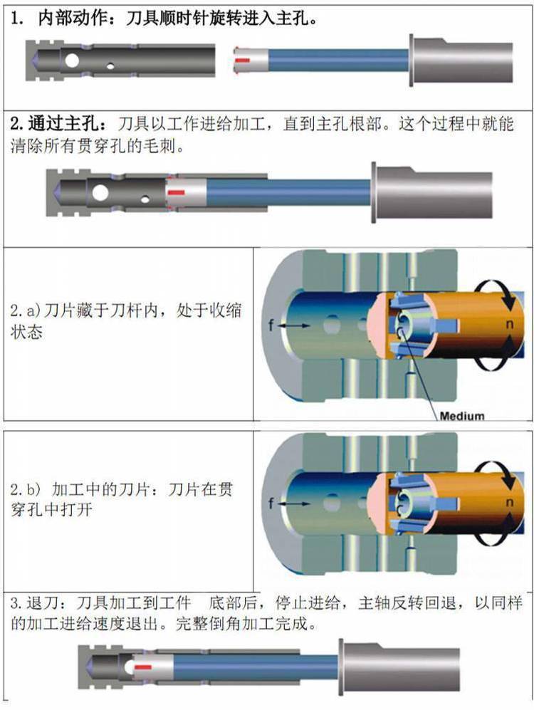 2.通过主孔:刀具以工作进给加工,直到主孔根部。这个过程中就能清除贯穿孔的毛刺。