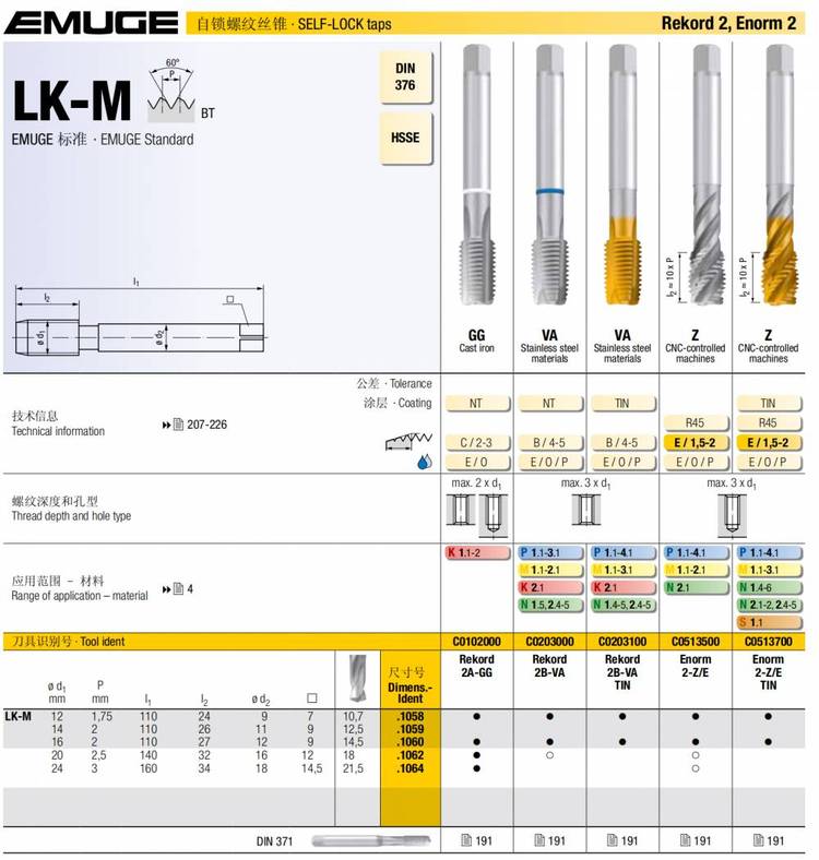 EMUGE自锁螺纹(防松螺纹)丝锥标准品选型表: