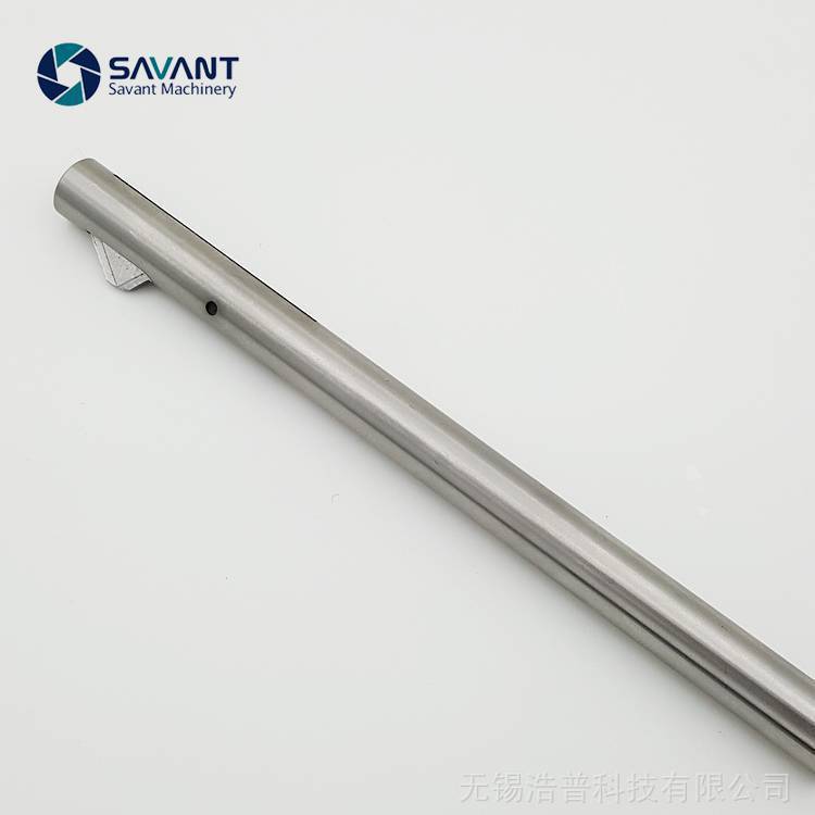结构介绍:倒角刀由刀杆体,刀片和弹性闭合槽构成;前段为入孔导向体,刀片前端为45度,内端为33度角,槽口为6度角。