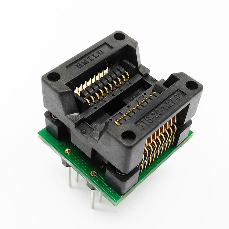 本款烧录座适配芯片规格:SOP封装、20PIN、引脚间距1.27mm、芯片本体(不含引脚)宽度5.4mm。