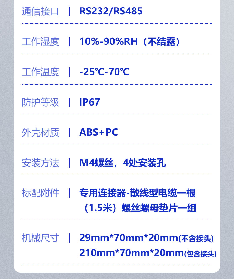 标配附件 | 专用连接器-散线型电缆一根(1.5米)、螺丝螺母垫片一组 | ||