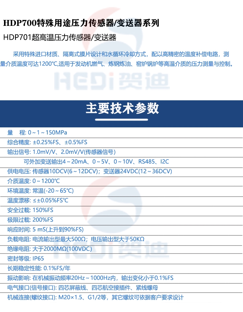 特殊定制超高温压力传感器HDP701专用于炼钢煤油 窑炉锅炉 发动机燃气等高温介质压力测量