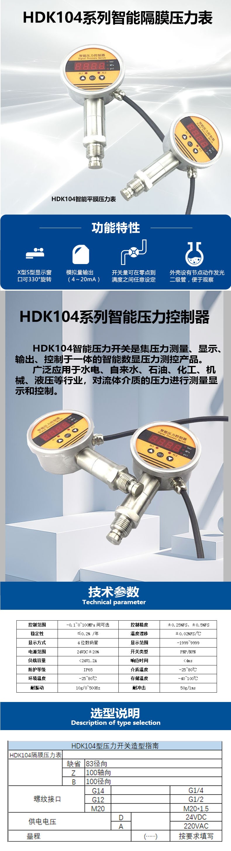 佛山工厂专业定制HDK104隔膜压力表 贺迪智能压力控制器可按要求贴牌