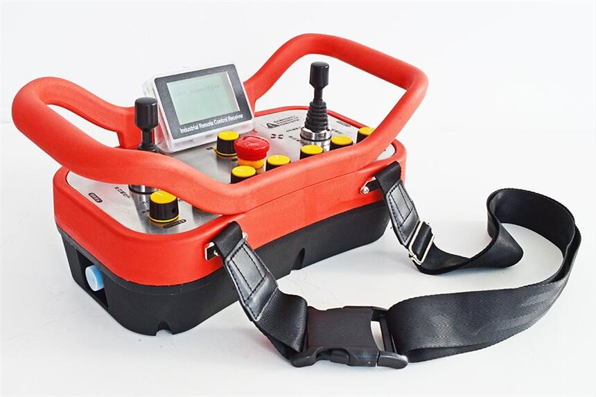 遥控器手持端布局及功能执行:启动 急停,1个四向五速摇杆,1个四方向模拟量比例杆或1个两方向模拟量比例杆,8个选择开关,1号摇杆四方五速摇杆用于控制塔吊的吊钩上下五速以及吊钩前后行走3速,2号比例杆用于控制塔吊吊臂的左旋、右旋模拟量输出控制,模拟量控制输出可调节0-10V、或0-5V,4-20mA。手持端采用箱体式,有背带,可悬挂于胸前操作,手握感良好,可按需定做文字标识或铭牌。开关量摇杆四方向五速,可实现前后左右四个方向动作,每个方向可实现5速控制,每个方向对应5路继电器输出,4个方向可输出开关量20路启动旋钮控制遥控系统整机启动,急停用于发射机和接收机及被控设备的总电源的紧急断开;双摇杆可协同动作,也可独立动作执行,功能多样化,满足多种复杂工业级无线控制需求。