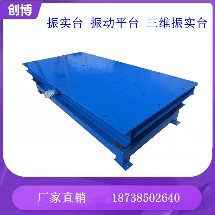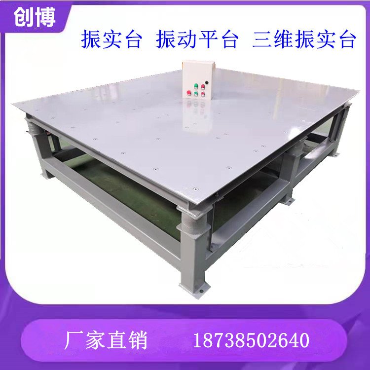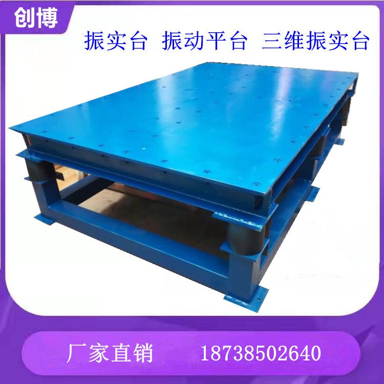 混凝土振动台主要由台底架、振动器弹簧等部件组成,台面与底架均用钢板和型钢焊接而成,振动台是用电动机加一对相同的偏心轮组成。并通过一对吊架联轴器安装在台面(反面)中心位置,起着振实过程中平稳、垂直方向的作用。振动台符合国家标准。主要用于试验室,现场工地作试件成型和预制构件震实各种板柱、梁等混凝土构件振实成型。