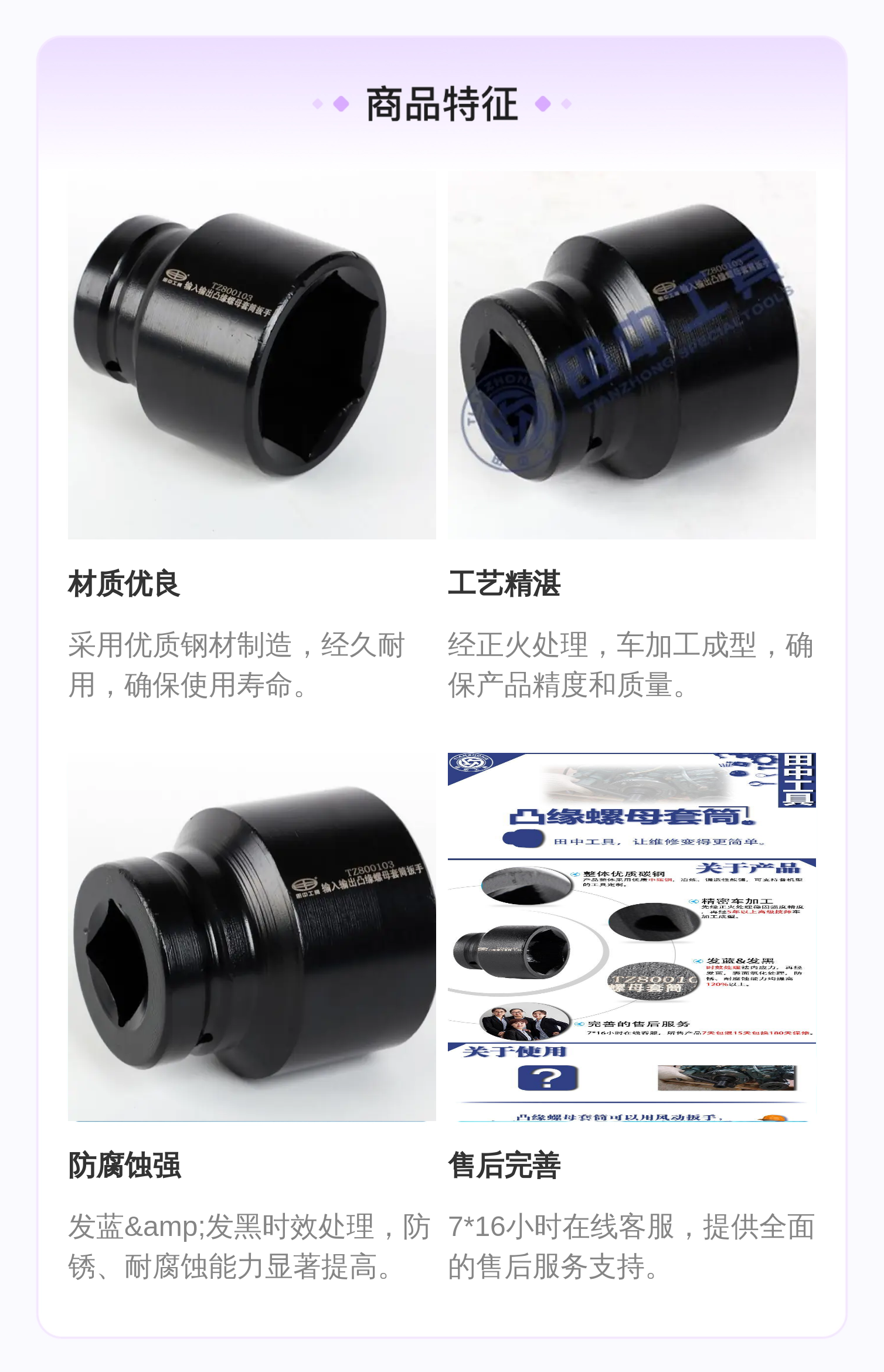 产品特性 | 整体优质碳钢材质,经久耐用 | ||