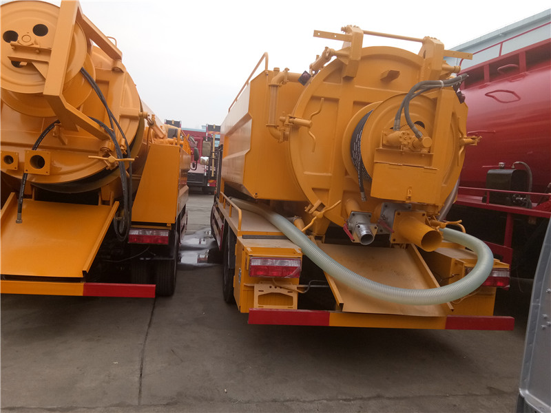 罐体有效容积5.81立方米,运输介质:液态污物,密度:900千克/每立方米;直段长4000mm,直径1300mm.侧防护材料为Q235,联接方式为连接支架固焊在付车架大梁上.后防护材料为Q235,连接方式:用结构连接件固焊在主车后端,后部防护装置断面尺寸(宽×高)50×130(mm),后部防护离地高度:490mm.整车长/轴距对应关系为(mm):7150/3950;7000/3800;6850/3650.随底盘选装同系列排半驾驶室,前面板等新风格.ABS型号为3631010-C2000,生产厂家为东科克诺尔商用车制动系统(十堰)有限公司.水罐和吸污罐为两个独立罐体,清洗功能时用水罐, 吸污功能