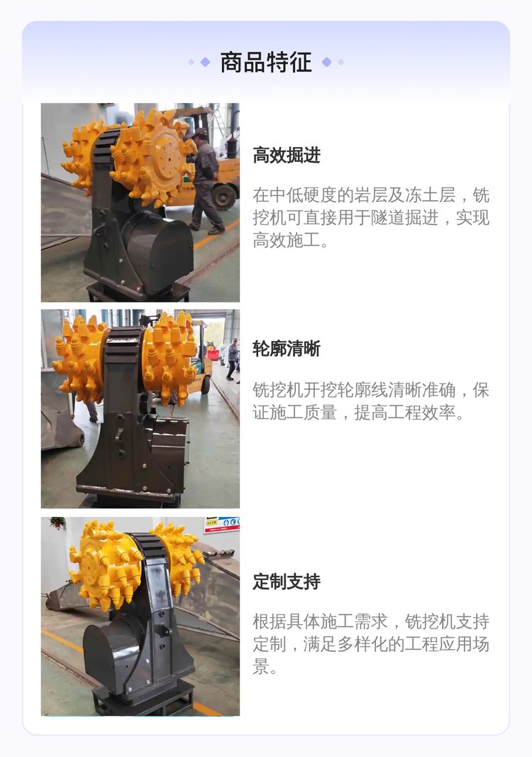 铣挖机 特别适合不宜爆破施工的地段;铣挖机操作简单,可控性高,开挖轮廓线清晰 准确;可轻松解决隧道内欠挖修整、内表面凿槽及开挖边沟等问题。