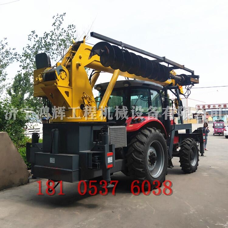独立研发的新型工程设备,该设备采用四轮驱动的拖拉机作为动力,集合钻孔挖坑,吊装电杆为一体,挖坑直径可到达。0.6米,标准深度:3米。 特点:全部采用液压控制,操作方便,单人即可完成操作,钻孔速度快,钻孔速度快,再普通黄粘土层最快钻孔速度为47秒,钻孔直径为500mm,深度为1米.再硬土层例如:路基,地基,保证没有大块石头的情况下钻孔速度为2分钟,冻土层可配冻土钻头钻孔速度为5分钟左右。 钻头安装在第二节吊臂上,实现了跨沟跨距钻坑。本机可旋转360度,在主体不动的情况下可旋转钻坑吊杆,大大提高了工作效率。 为前置式钻孔,比其他厂家后置式钻孔机,操作简单。 804拖拉机,马力大,动力充沛。钻孔无需清土,一个人即可完成工作,钻到深度后,可靠吊臂提起,土都附着在螺旋叶片上,很少有回落。提起后只需将钻杆正反转动记下土就会自然落下。 可以实现单人操作,车到孔成,随钻随走。大大提高工作效率。 起吊高度分为:13米型、15米型,起吊重量为3T、5T. 采用四轮驱动拖拉机改装而成,越野性能好。 大大摆脱了普通吊车收地形限制的局限性,可以方便引用于狭窄的小巷,乡间田野,水田,丘陵等地带。特别适合于电力施工单位及其他在狭窄区域能作业的施工单位。