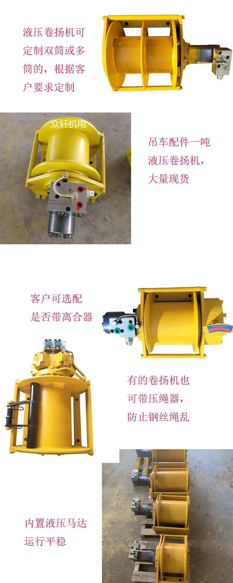 液压卷扬机通常由液压马达,控制阀组,齿轮箱,滚筒,支架,(离合器),压绳器或排绳器,安装支架等组合而成。有的液压卷扬机并未带支架,直接由液压马达,控制阀组,滚筒,末端支承轴等组成,这些都可以根据客户的需要进行选配的,可广泛用于输送机张紧装置,工程机械起重机械如汽车吊,履带吊,高空作业车,林业起重机,以及港口船舶类的如港口吊,浮船吊,挖泥船,克令吊,吊艇架,以及可以用于大型的起重设备如石油钻机,海上石油钻井平台,桩工机械类的旋挖钻机,凿岩钻机,岩心钻机,静液压压桩机等等。