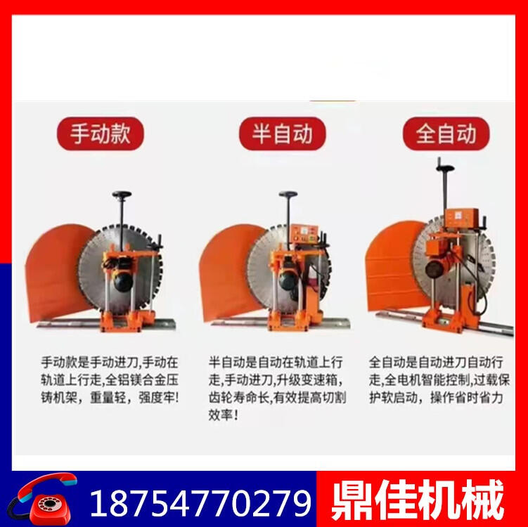 · 此款设备操作简单,用膨胀螺丝固定好轨道,机器放轨道上(轨道上有锯齿,机器上有齿轮不会滑落,只能用手轮操作移动),装好锯片,防护罩,通水通电后就两手轮操作,中间手轮控制锯片上下刀,右边手轮控制机器在轨道上移动。