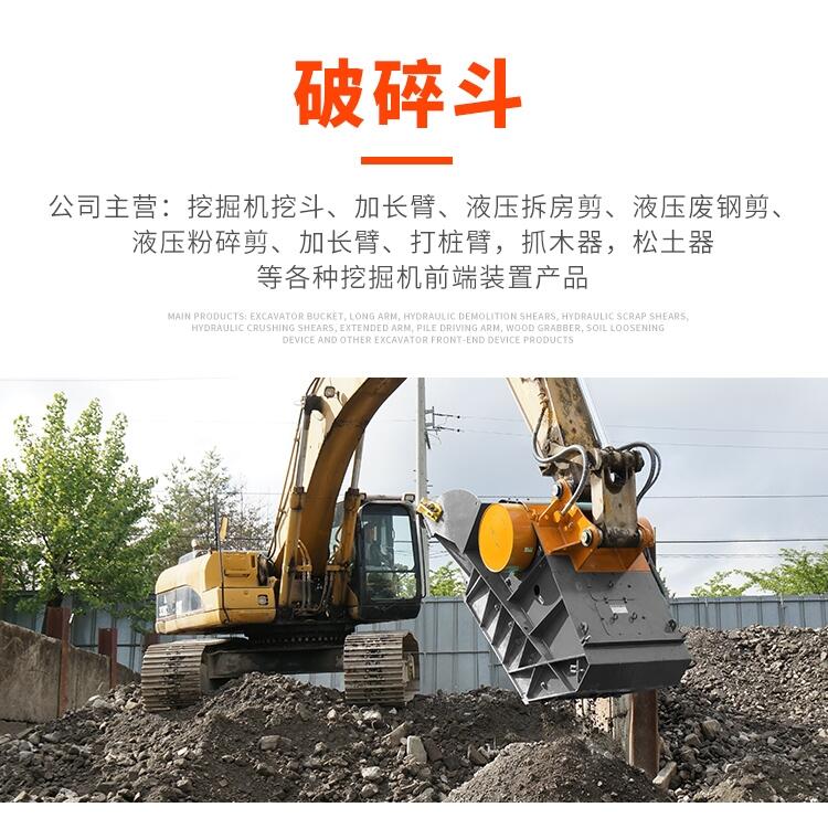 本颚式破碎斗采用先进的液压技术,使用马达转动带动颚板将混凝土,石块等挤碎,使达到设定要求的碎料从排料口吐出,小于排料口的钢筋在也可以同时从排料口排出。