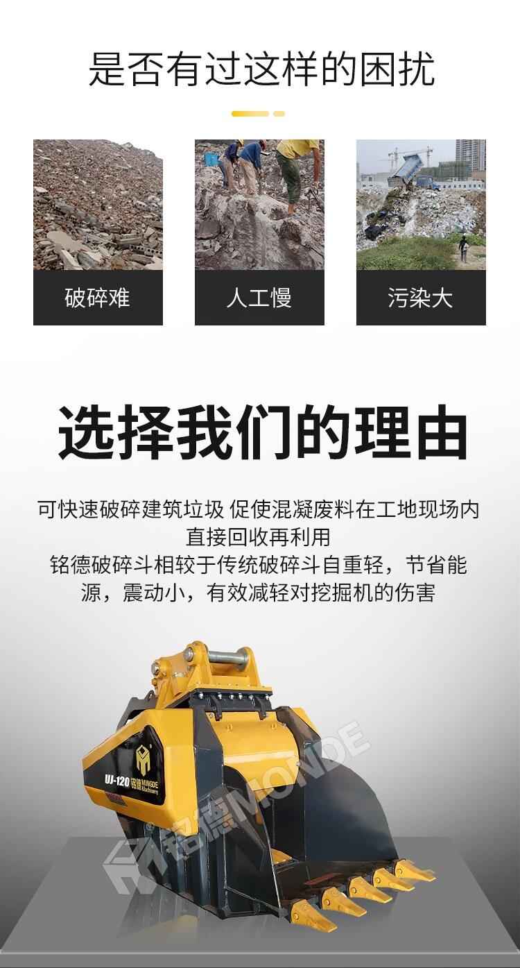 挖掘机破碎斗适用于破碎坚硬的岩石, 广泛应用于采石,矿山,砾石以及废弃材料和沥青的回收利用等。破碎铲斗适合于重量超过10吨的挖掘机,破碎铲斗紧凑,多用途并适用于破碎和回收处理惰性材料,或因拆除产生的建筑材料(道路工程-基建-管道及管线)。 与较大的机型相比,尽管其体积小,自重轻,但产量可达到20-30吨/小时。 适用于破碎坚硬的岩石, 广泛应用于采石,矿山,砾石以及废弃材料和沥青的回收利用等。