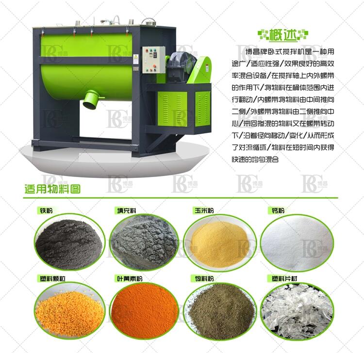 卧式搅拌机是一款专业针对大量搅拌粉体与粉体、粉体与颗粒、粉体与塑料、粉体与少量液体的塑胶机械,广泛适用于化工、塑料、塑胶原料、饲料及食品行业的混合搅拌
