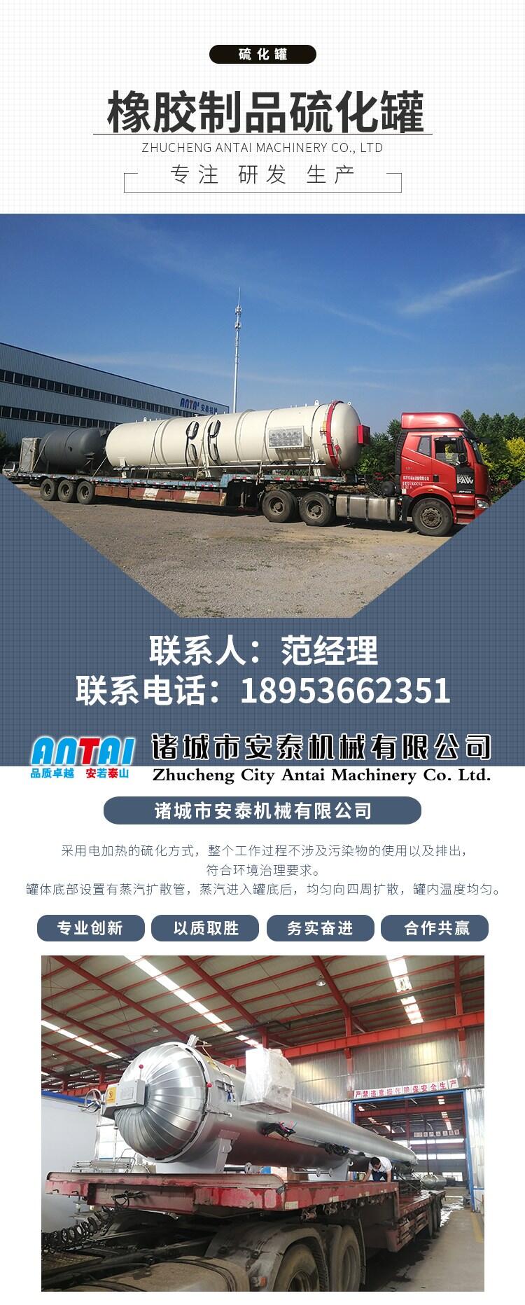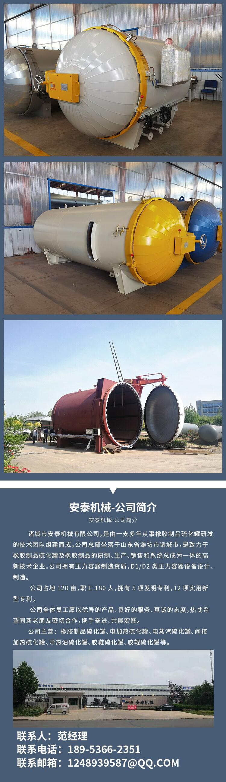 三、橡胶制品硫化罐生产厂家——诸城市安泰机械有限公司公司成立于2008年,拥有压力容器生产资质,是众多科研院所的合作厂家,安泰机械致力于橡胶硫化罐的研发生产,主营:电蒸汽硫化罐、直接蒸汽硫化罐、间接蒸汽硫化罐、导热油硫化罐、电加热硫化罐、半自动硫化罐、全自动硫化罐、胶鞋硫化罐、胶辊硫化罐、电缆硫化罐、胶管硫化罐、立式硫化罐等。公司拥有一支的售后团队,多名经过厂家认定资格的维修工程师,根据设备实际使用情况,安排售后人员负责整个设备,为设备提供更科学的使用方法。