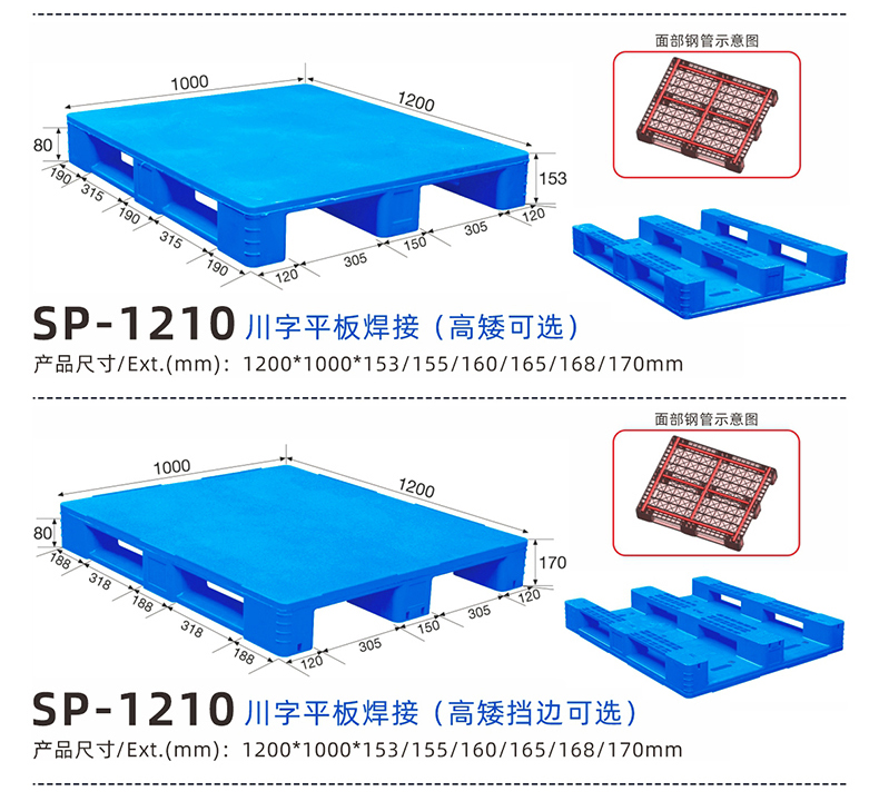 川字网格型:川字网格型塑料托盘采用全方位镂空加强筋设计,有效防止托盘损坏增加产品载重能力、抗压能力、抗冲能力。