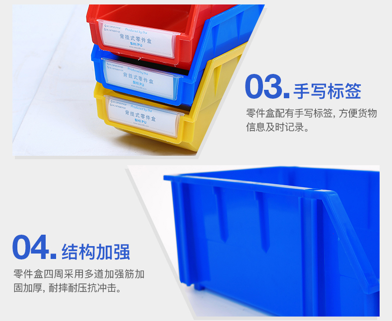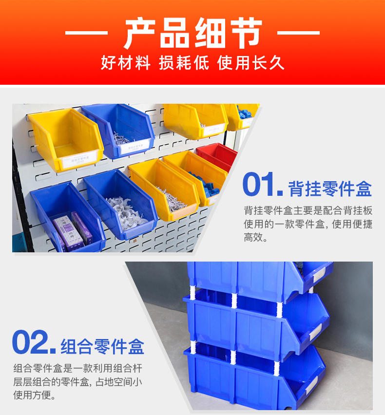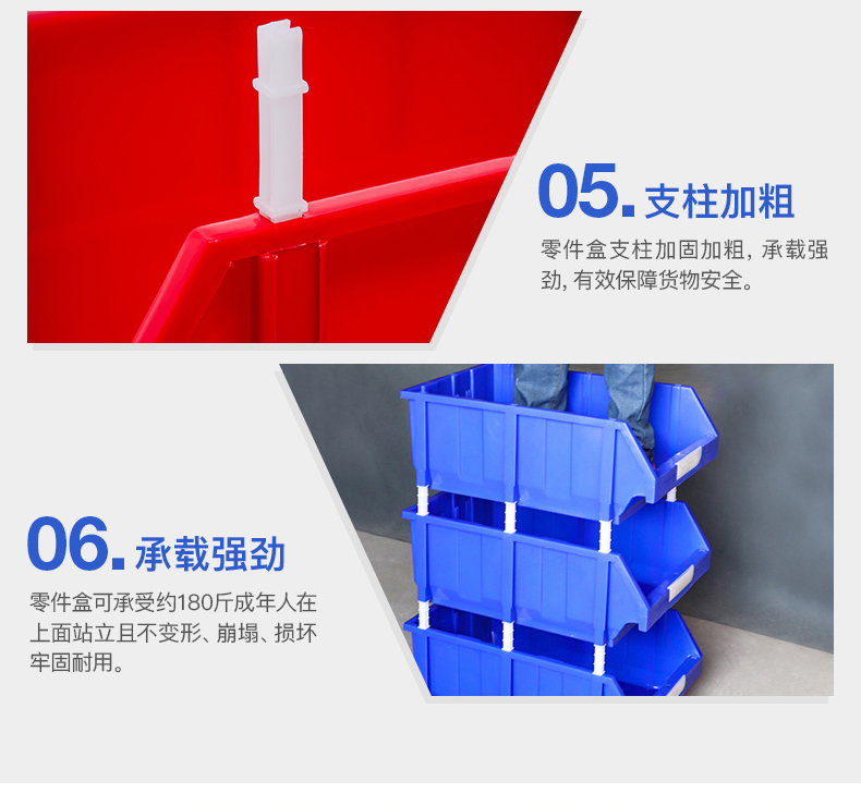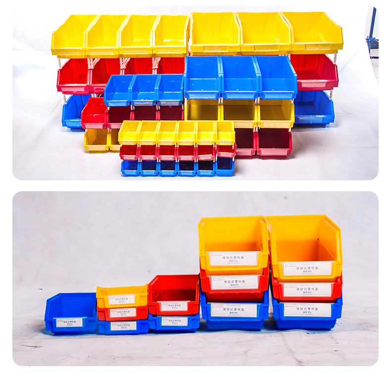 材质为高密度聚乙烯HDPE材料;在零件盒的收纳方面,本产品可堆叠,堆叠存放,不占用空间。