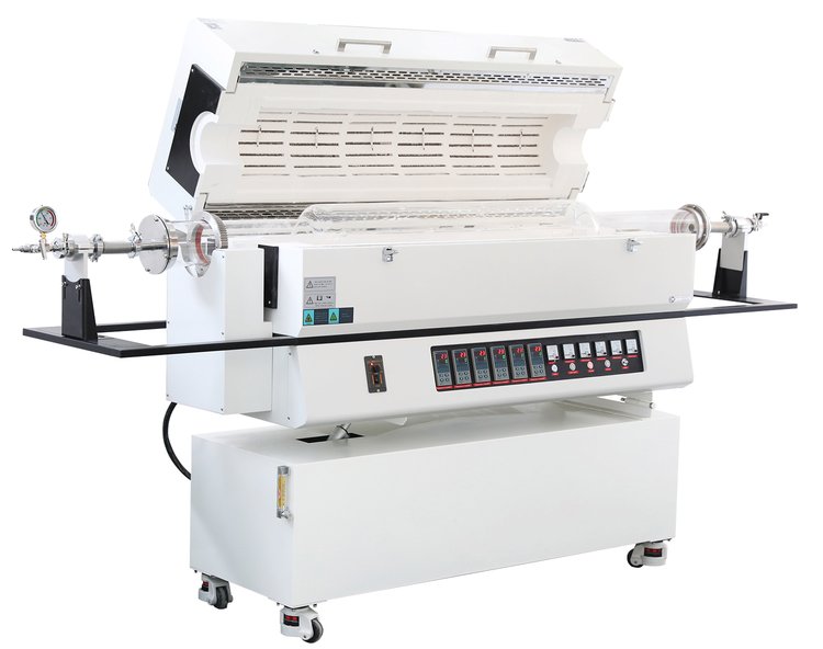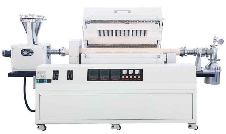 高温回转炉采用硅钼棒双温区加热,每个温区可30段程序控温系统,移相触发、可控硅控制,炉膛采用氧化铝多晶体纤维材料,温场均衡,双层炉壳间配有风冷系统,能快速升温;加装有密封自动送料器、密封收料装置。炉体可倾斜,炉管可360度旋转。该设备专业应用于锂离子电池的阴极材料上包覆导电层,同时也可用CVD方式制备si/c阳极材料。
