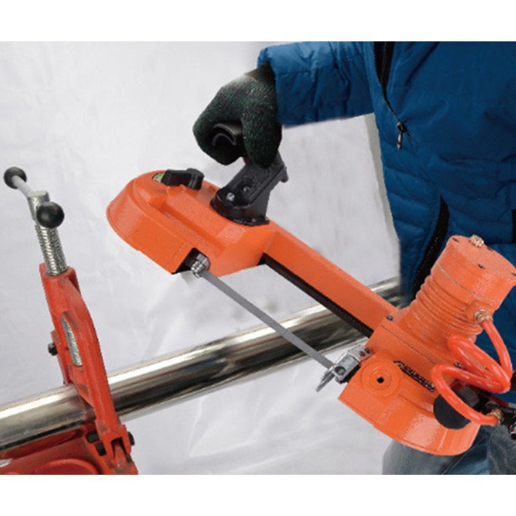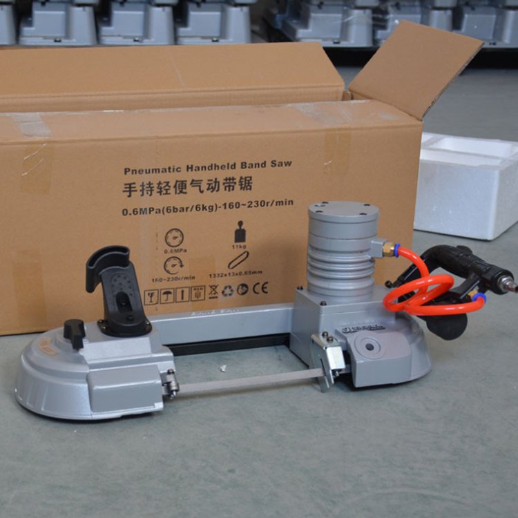 4.5用手指按压马达阀杆控制开关启动气马达,待带锯运转正常后,再轻轻接近被割工件,等切入一定深度后,再慢慢加力,然后快速切割。