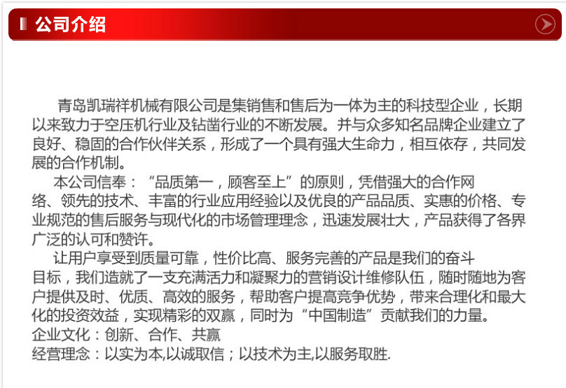 青岛凯瑞祥机械有限公司 多年来主要经营螺杆式活塞式涡旋式空气压缩机、各种钻机:潜孔钻机、分体式潜孔钻机、整体式潜孔钻机、凿岩钻机、履带式液压钻机、全液压顶锤式钻机,锚杆钻机、跟管钻机、打抗浮钻机、水井钻机、光伏支架工程打桩钻机、液压高速夯实机、打桩钻机、爆破钻机、直推式土壤取样钻机、工程钻机、地下掘进台车、风镐、冷干机、储气罐,喷浆机以及黑金刚冲击器、钻头钻杆钻具产品,各种零配件销售服务的专业机构。多年来公司秉承重细节、铸品质、创未来的企业宗旨,致力于为您提供全面优质高效的服务。