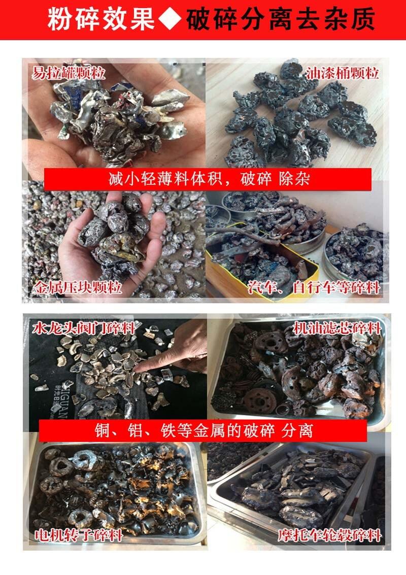 漆桶破碎机又eww叫废钢铁破碎机,是专门用于粉碎漆桶等废钢铁的vsd机器,该机根据产量,出料大小分为十几个型号,机身通体采用加厚钢板制成,内衬以及筛网锤头为合金铸造,重量大分量足,对于各种金属废料有非dsw常好的破碎效果。通过破碎可将物料打成一定规格大小的颗粒,并将漆桶中杂质和金属分离开。再通过磁选机,就可以轻松完成漆桶中铁的自动回收!漆桶属性决wew定了破碎机设备型号,不同的金oty属废料,材质、性质、成份不同,软硬度不同,对症下药才能获得大利益。常见废料比如漆桶、薄铁皮、易拉罐此类型软质金属料,比较好容易破碎,选择小型号的漆桶破碎机,不仅破碎效率高,而且成本也不会浪费。