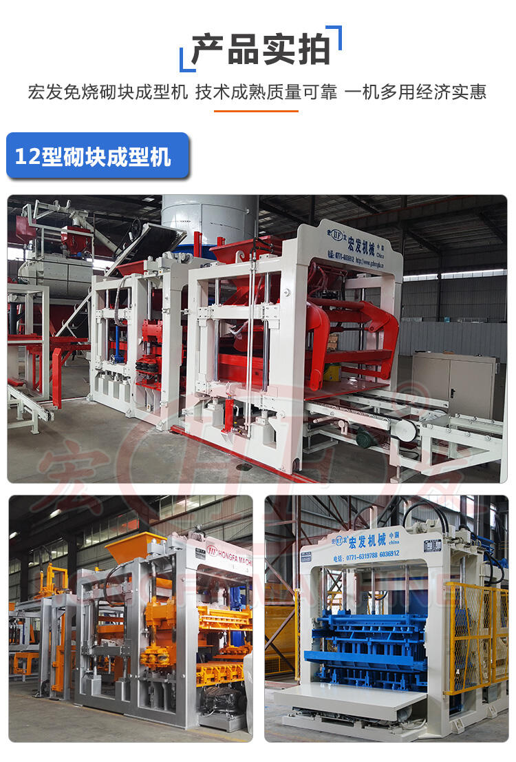宏发水泥砌块成型机有多种规格型号,分有每模生产12块机型、10块机型、8块机型、6块机型、4块机型,包含大中小型免烧砖机,满足不同客户需求。