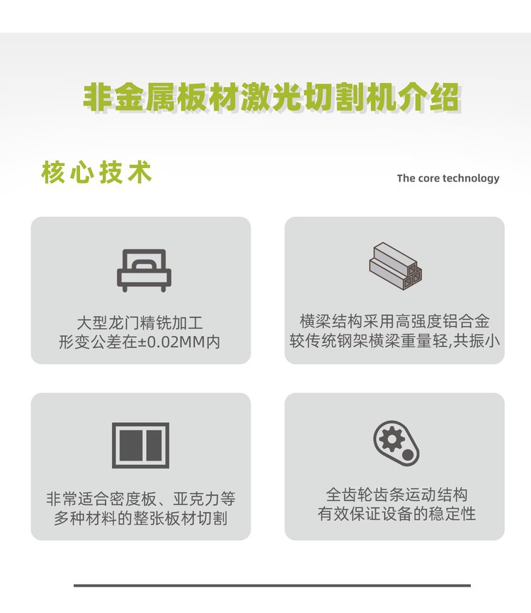 非金属板材激光切割机主要适用于木板材、木夹板、中密度板、亚克力板等大幅面非金属板材开料、裁切.加强型焊接床身,大型龙门精铣加工,经退火处理并振动时效消除应力,形变公差在±0.02mm内;横梁结构采用高强度铝合金,较传统的钢架横梁具有重量轻、共振小、运行更平滑等优势.