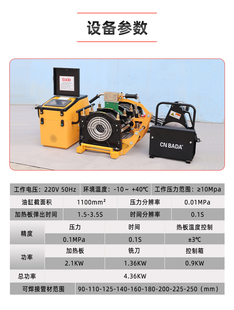 可焊接管材范围 | 90-110-125-140-160-180-200-225-250 (mm) | ||