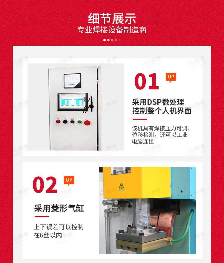 设备应用 | 汽车制造行业高强度钢、热成型钢的点焊和螺母凸焊, 也可应用于普通的低碳钢板、不锈钢板、镀锌板、铝板、线材的点焊、多点凸焊, 以及高低压电气行业铜线的电阻钎焊、点焊,银点和铜板的钎焊、复合银点焊接等 | ||