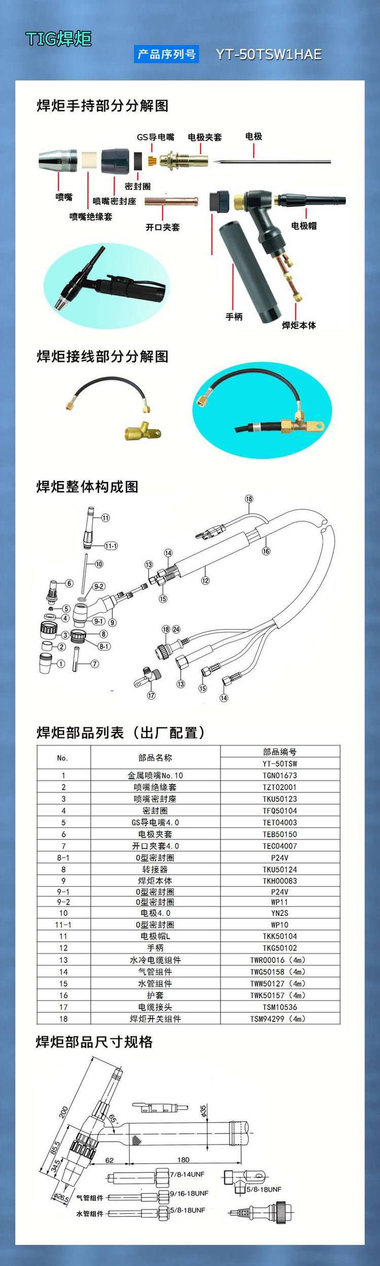 松下50TSW1系列TIG焊炬只有端子一种接口,电缆长度有4米和8米2种标准规格,也可以根据需要定制长度,建议不超过20米。枪头有角型(弯柄,型号为50TSW1)1种型式,采用水冷方式。