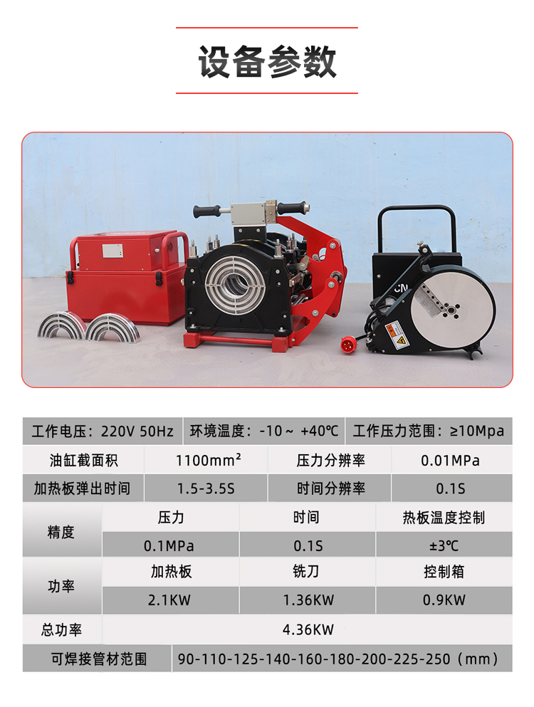 可焊接管材范围 | 90-110-125-140-160-180-200-225-250 (mm) | ||