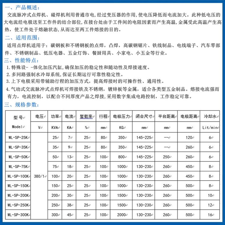 点焊机适用于:碳钢板和不锈钢板的点焊,凸焊机,碳钢锯片点焊机、铁线制品点焊机、电线端子点焊机、汽车零部件点焊机、不锈钢制品、低压电器、五金灯饰、餐厨用具、小家电、小五金等行业。