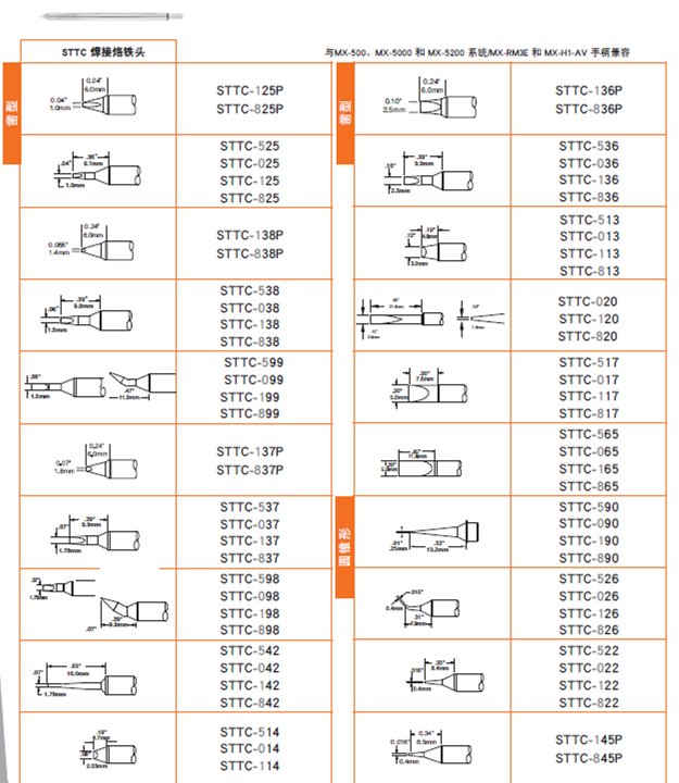 STTC系列烙铁头用于MX系列主机上,该烙铁头不能用于SP200系统,也不能用于镊型手柄和除锡手柄.