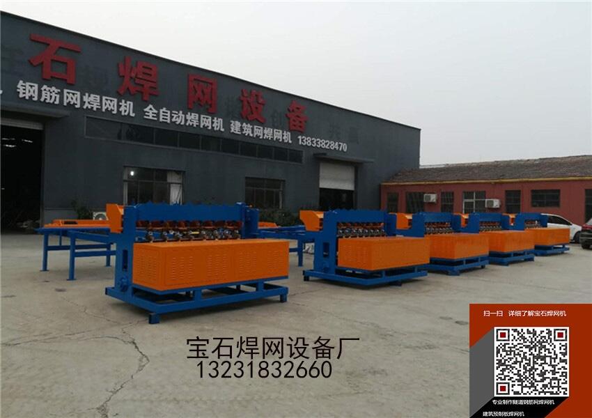 ? ?宝石隧道钢筋网焊网机电动机动力,采用同步控制技术,分控焊接与焊接时间均由数控控制,输入面板为触摸屏,操作合理化,并且具有一次压紧,分次焊接的特点,焊接动力为电动,采用步进电机料斗,制动电机驱动小车送经,步进电机驱动小车拉网。经丝与纬丝均由校直机校直切断,竖丝人工摆放,横丝自动落丝。