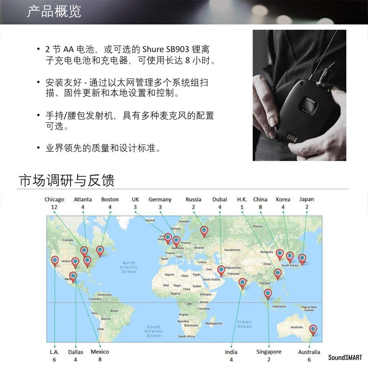 2节AA电池壳持续使用长达8小时,也可选配舒尔SB903可充电锂电池