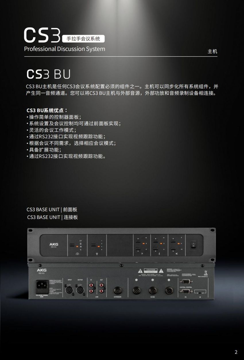 CS3会议系统是一套模块化的灵活的会议系统,适用于中小型会议应用。它可靠的组件能很简单地组装、布线和扩展。一台CS3主机单元可以支持60台话筒单元。主机单元可以连接相关设备如PA、录音机、外部音源和录像控制系统。不同的操作模式可以实现自动或操控会议,而不需要电脑控制。 CS3话筒单元带有一个牢固的接口,可以简单地替换话筒。话筒可选择CS321或CS521鹅颈话筒,它们均带有心形指向电容拾音头,分别长30厘米(12英寸)和50厘米(20英寸)。 CS3安装便捷、使用简单,而且还保持了AKG一贯的优良音质。其牢固和优雅的设计可用于任何地方。
