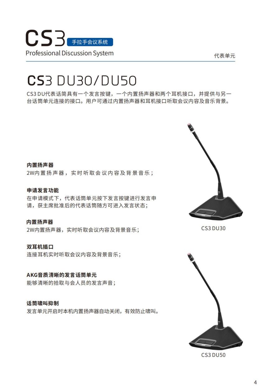 CS 3 DU30/DU50CS3DU代表话简具有?个发?按键,?个内置扬声器和两个?机接?,并提供与另?台话筒单元连接的接?。??可通过内置扬声器和?机接?听取会议内容及?乐背景。内置扬声器2W内 置 扬 声 器 , 实 时 听 取 会 议 内 容 及 背 景 ? 乐 ;申请发?功能在申请模式下,代表话筒单元按下发?按键进?发?申请,获批准后的代表话筒随?可进?发?状态;内置扬声器2W内置扬声器,实时听取会议内容及背景?乐;双?机插?连接?机实时听取会议内容及背景?乐;AKG?质清晰的发?话筒单元能够清晰的拾取与会?员的发?声?;话筒啸叫抑制发?单元开启时本机内置扬声器?动关闭,有效防?啸叫。