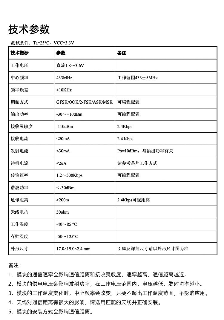 调制方式 | FSK、GFSK(可编程配置) | ||